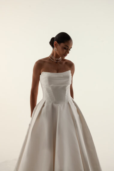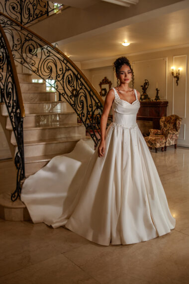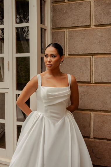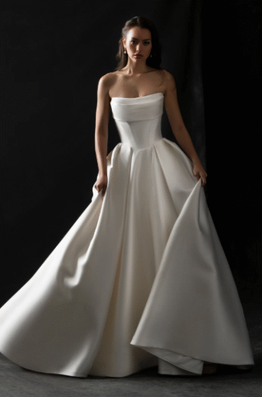 A cintura basque, ou cintura basca, é uma modelagem do corpete de noiva que se destaca pelo formato em “V” na linha da cintura, descendo suavemente em direção ao quadril. Esse acabamento cria um desenho marcado entre o corpete e a saia, podendo aparecer tanto em corsets separados quanto em vestidos inteiros. Diferente da cintura tradicional, que é reta, a basque é facilmente reconhecida pela linha assimétrica, com a parte frontal mais alongada que as laterais, formando um pequeno bico.