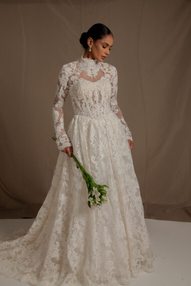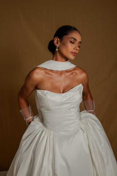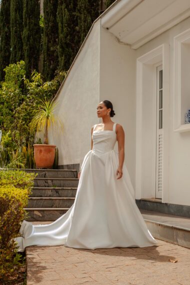 Ao longo do texto, deu para perceber como a cintura basque vem se destacando entre as tendências de vestidos de noiva. A modelagem em “V”, o caimento estruturado e a forma como ela valoriza diferentes silhuetas fazem desse detalhe um dos favoritos de muitas noivas.