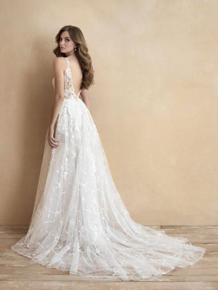 Vestido de noiva confeccionado em tule e renda, com corte evasê. O decote em V e cauda discreta trazem suavidade ao modelo. Especialmente para noivas que buscam um visual boho romântico.