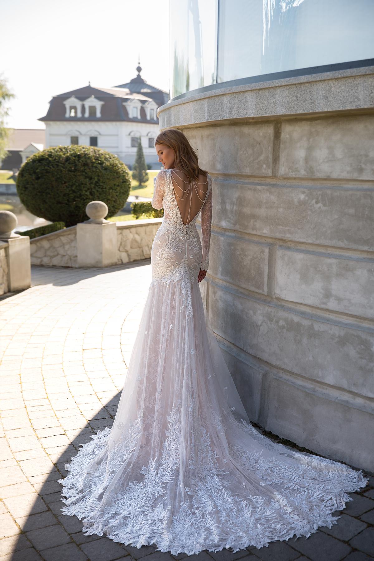 Vestido de noiva confeccionado em tule com aplicações de pedrarias e corte sereia. O decote em V, mangas e cauda longa trazem sensualidade na medida certa ao modelo. Especialmente para noivas que buscam um visual glamouroso.