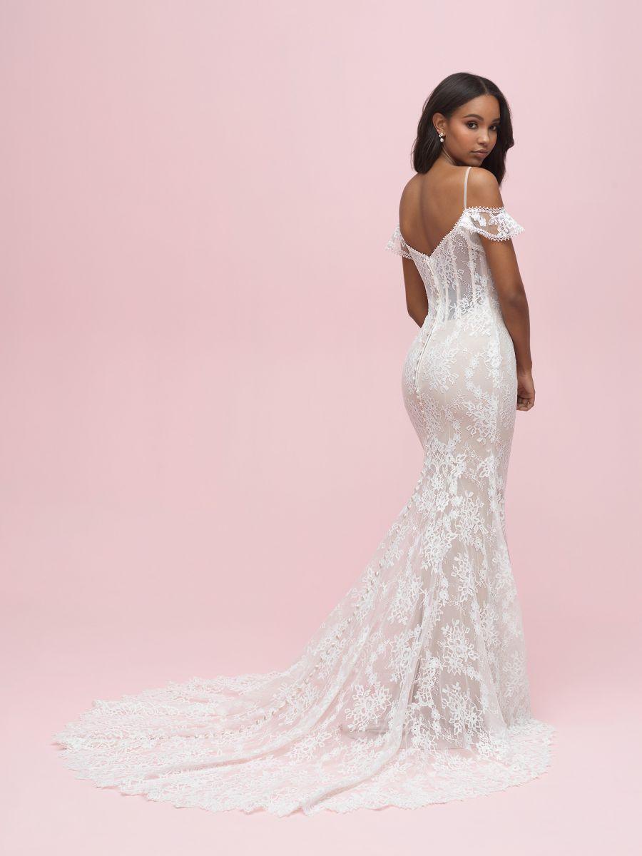 Vestido de noiva confeccionado em renda chantilly em corte semi sereia. O decote coração e as mangas ombro a ombro trazem romantismo ao modelo. Especialmente para noivas que buscam um visual marcante e delicado.