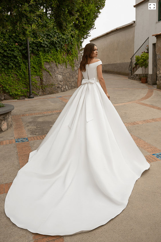 Vestido de noiva confeccionado em cetim mikado, com corte princesa. As mangas ombro a ombro, detalhe em V no decote e cauda longa trazem uma aparência clássica ao modelo. Especialmente para noivas que buscam um visual minimalista.