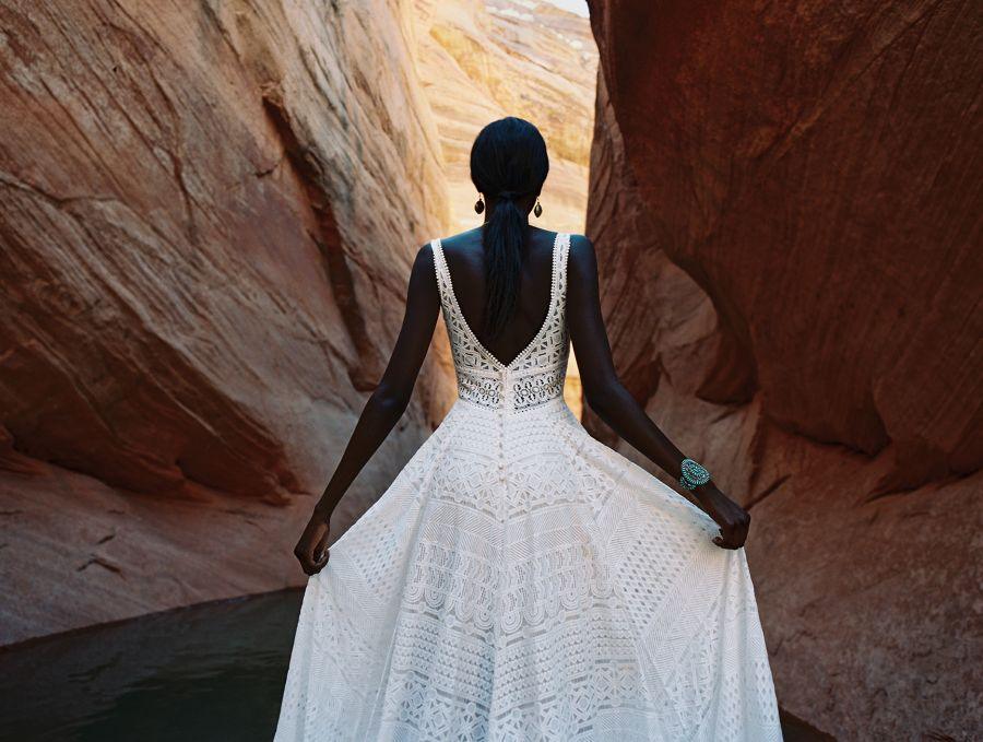 Vestido de noiva confeccionado em renda crochetada, com corte evasê. Possui decote em V no busto, costas e cauda arredondada que trazem leveza e frescor ao modelo. Especialmente para noivas que buscam um visual boho moderno.