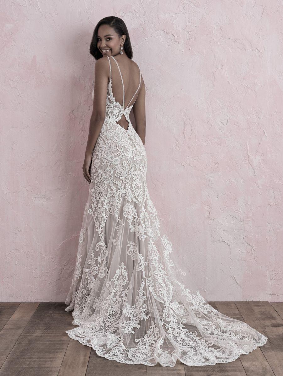 Vestido de noiva confeccionado em renda arabesco com aplicações em pedrarias e corte semi sereia. O decote em V, recorte nas costas e cauda discreta trazem sensualidade na medida certa ao modelo. Especialmente para noivas que buscam um visual glamouroso refinado.