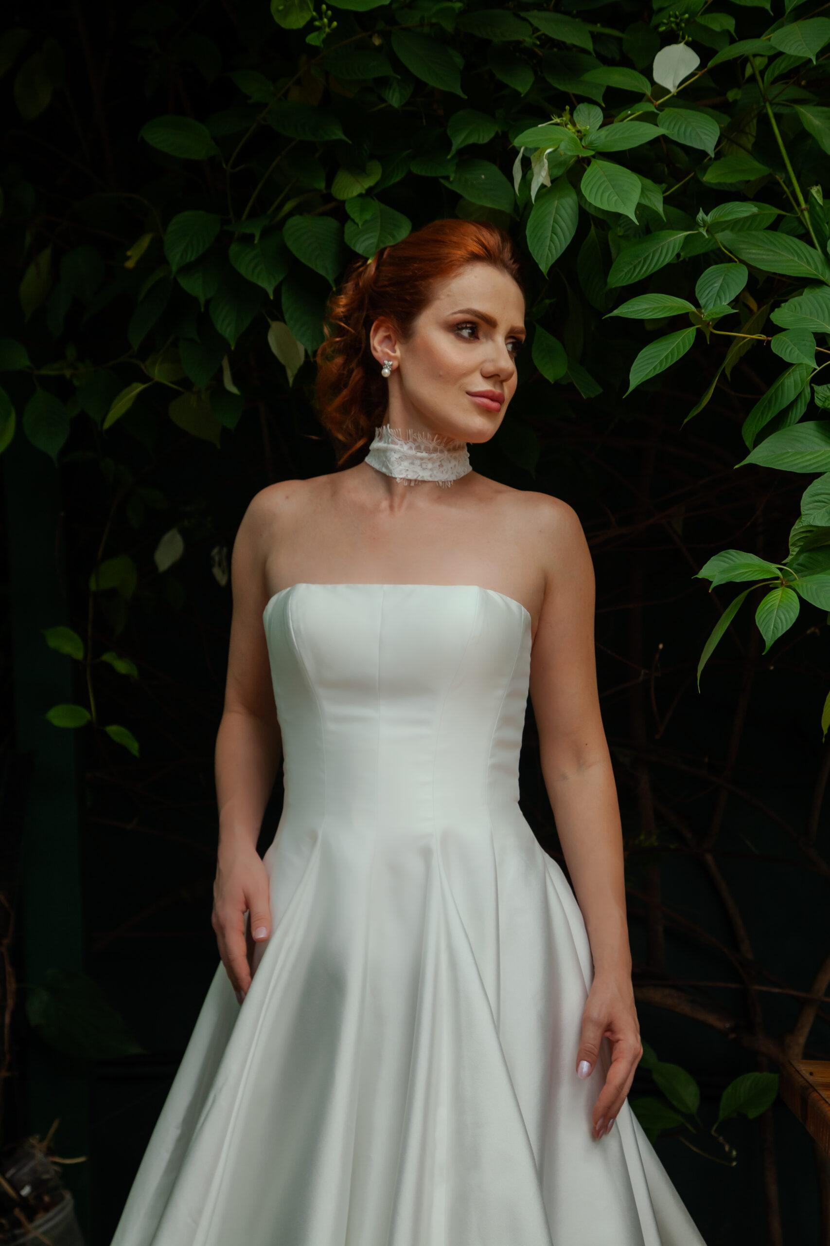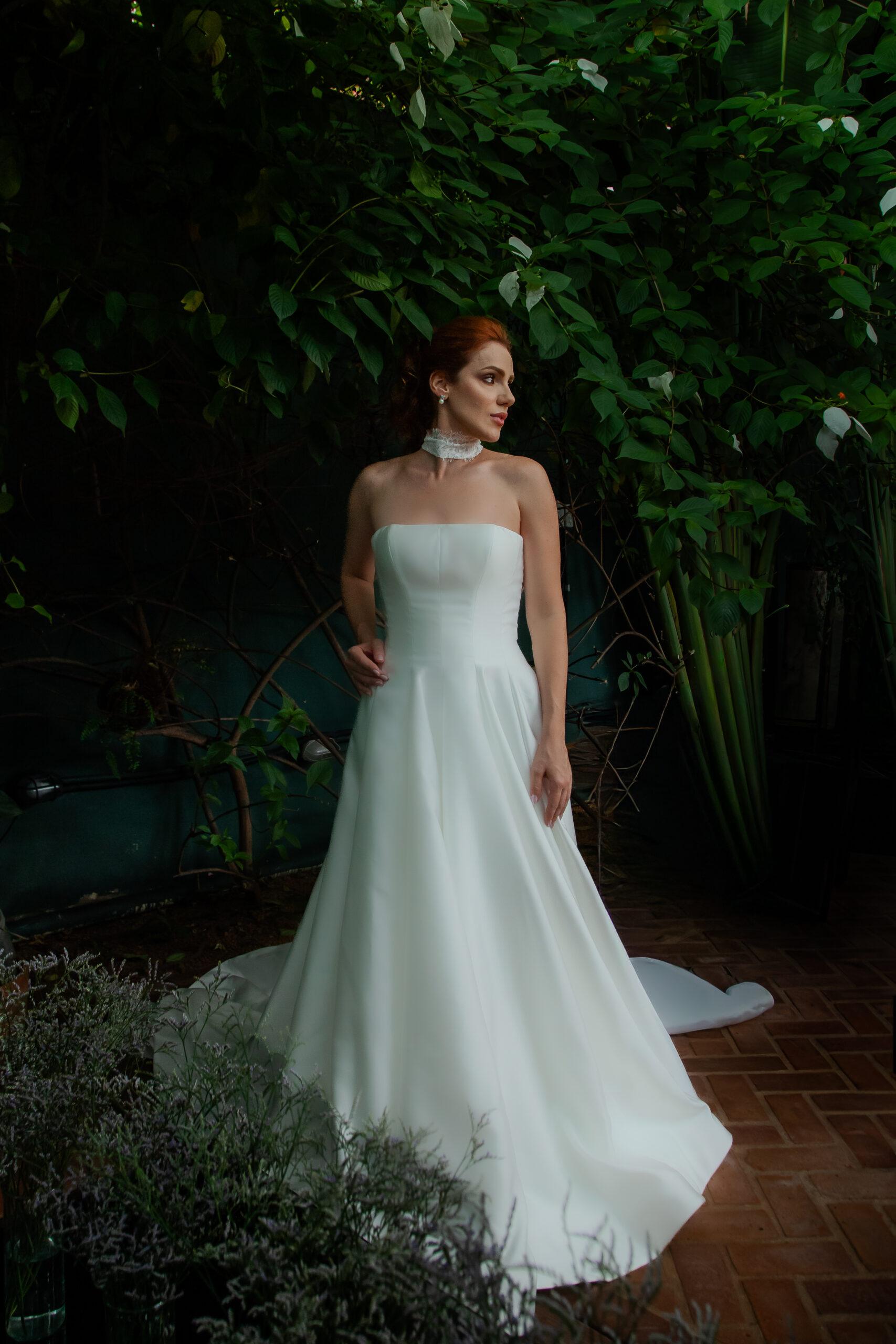 Vestido de noiva confeccionado em mikado, com corte evasê. O decote tomara que caia, corset estruturado e saia com nesgas trazem elegância clássica ao modelo. Especialmente para noivas que busam um visual minimalista e versátil.