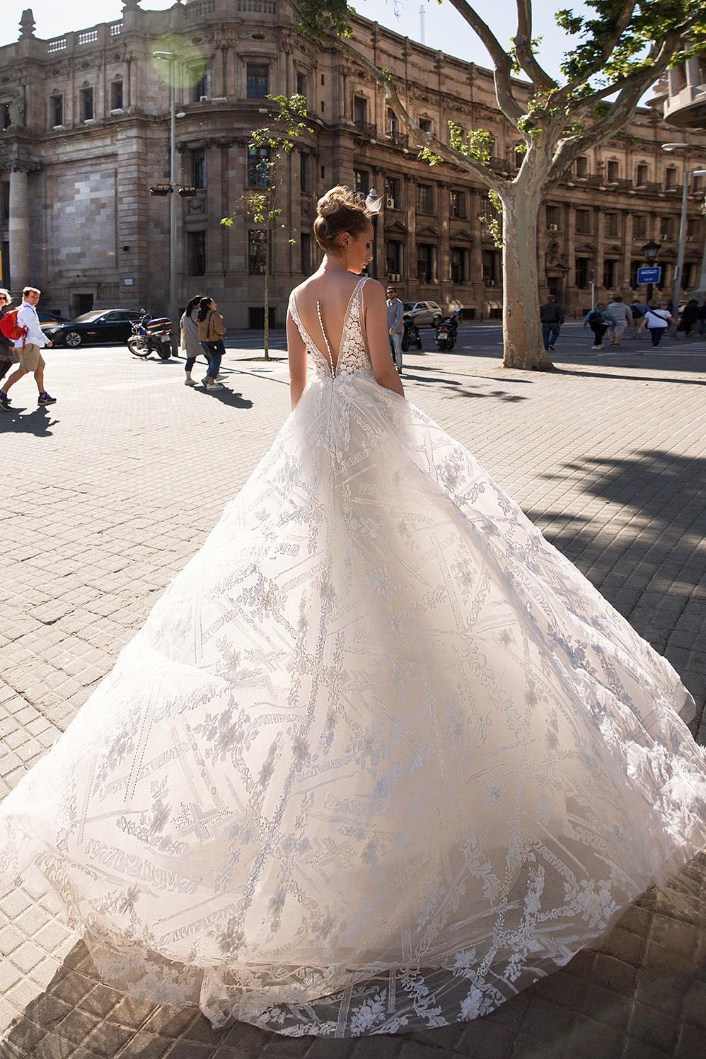 Vestido de noiva confeccionado em renda e tule, com corte princesa. O decote V profundo, aplicações 3D florais e transparência no busto trazem equilíbrio sensual ao modelo. Especialmente para noivas que buscam um visual romântico repaginado.