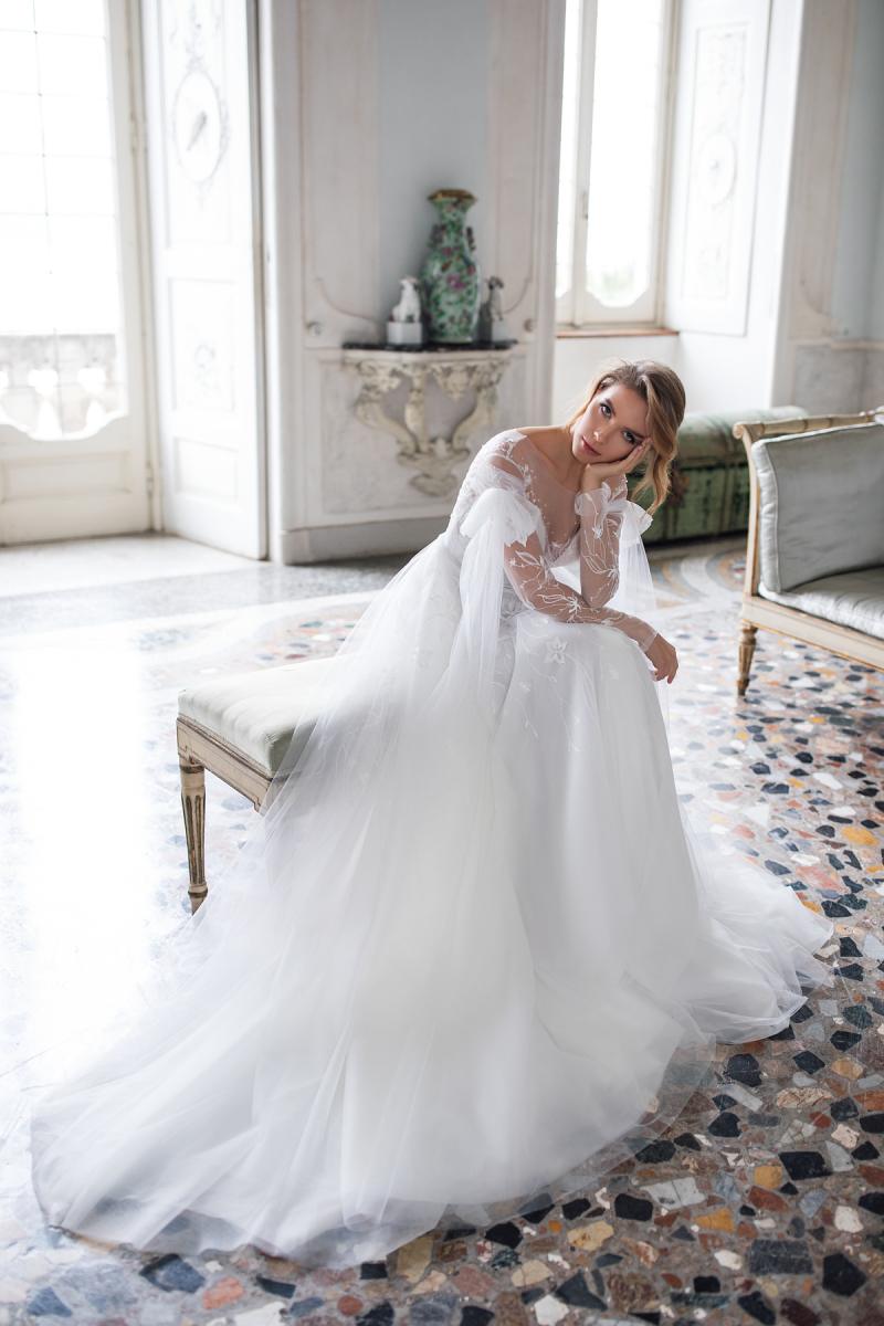 Vestido de noiva confeccionado em tule com renda nas costas e corte evasê. O decote coração e cauda fluida trazem delicadeza ao modelo. Especialmente para noivas que buscam um visual minimalista romântico.
