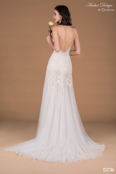 Vestido de noiva confeccionado em tule e renda, com corte semi sereia. O decote V, alças finas e cauda média fluida trazem leveza ao modelo. Especialmente para noivas que buscam um visual equilibrado entre romantismo e sensualidade.
