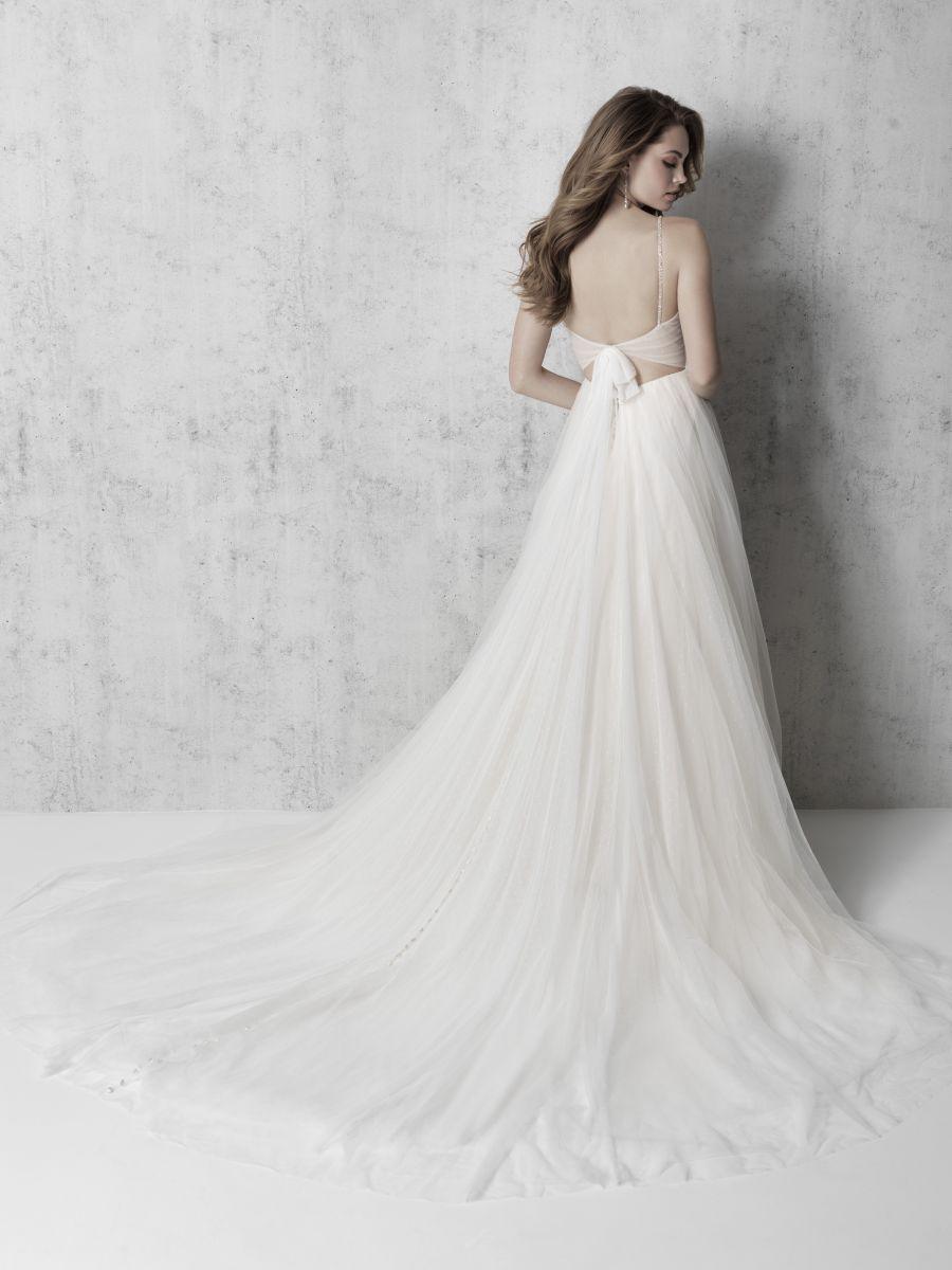 Vestido de noiva confeccionado em tule, com corte evasê. Possui decote em V, cinto em cristais e cauda discreta, que traz uma aparência sofisticada ao modelo. Especialmente para noivas que buscam um visual minimalista.