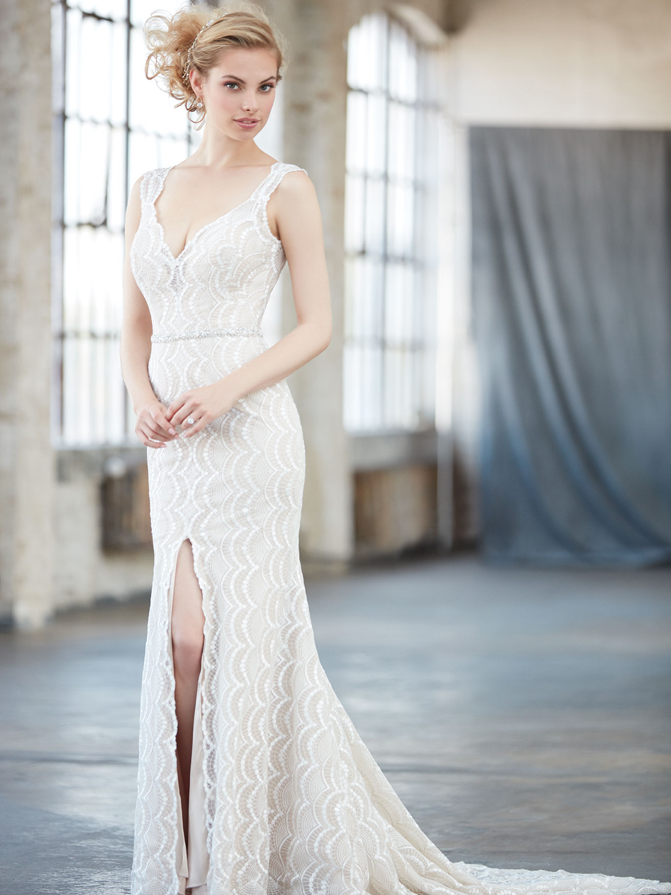 Vestido de noiva confeccionado em renda, com corte semi sereia. O decote leve, fenda lateral e costas nuas trazem sesualidade na medida certa ao modelo. Especialmente para noivas que buscam um visual elegante.